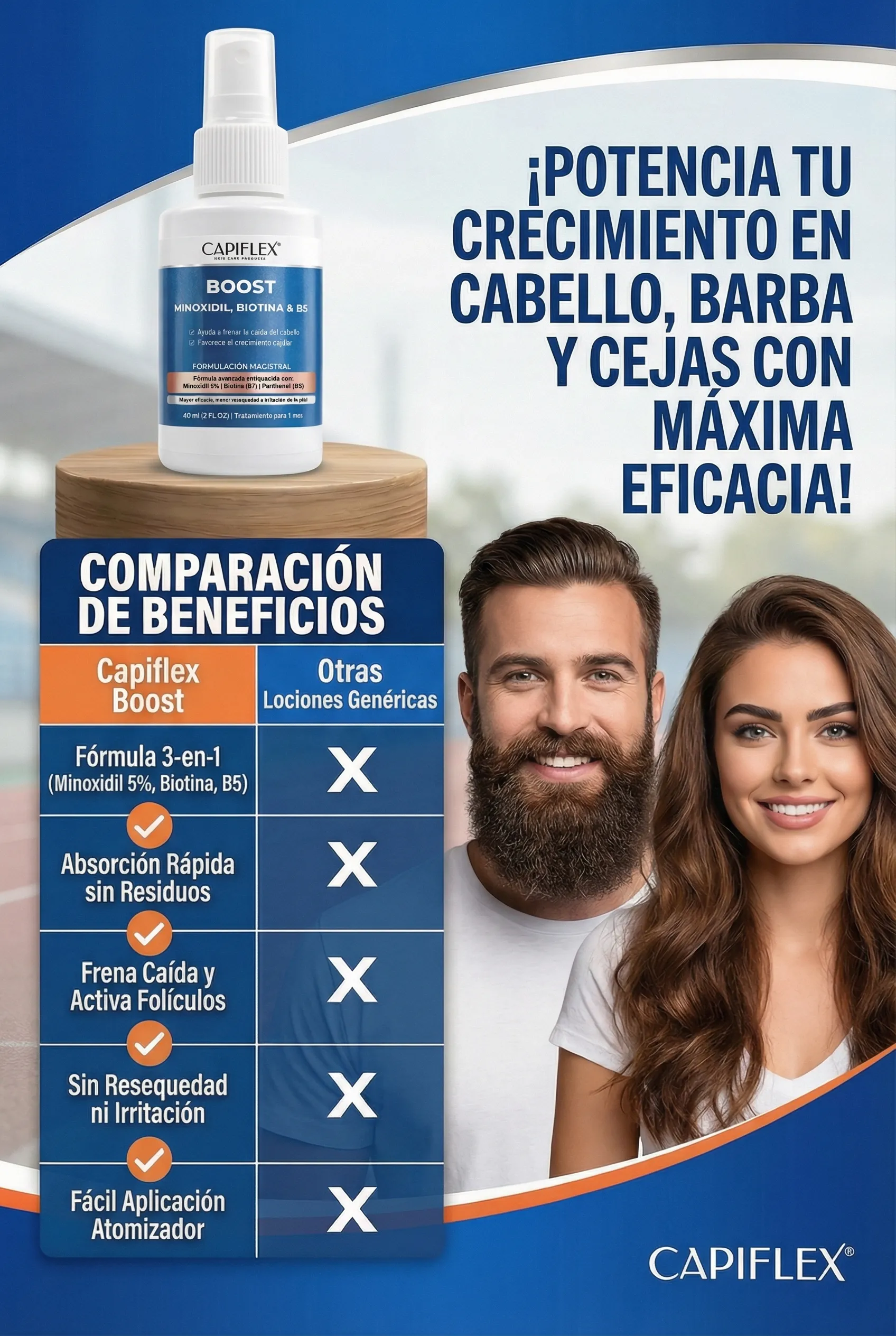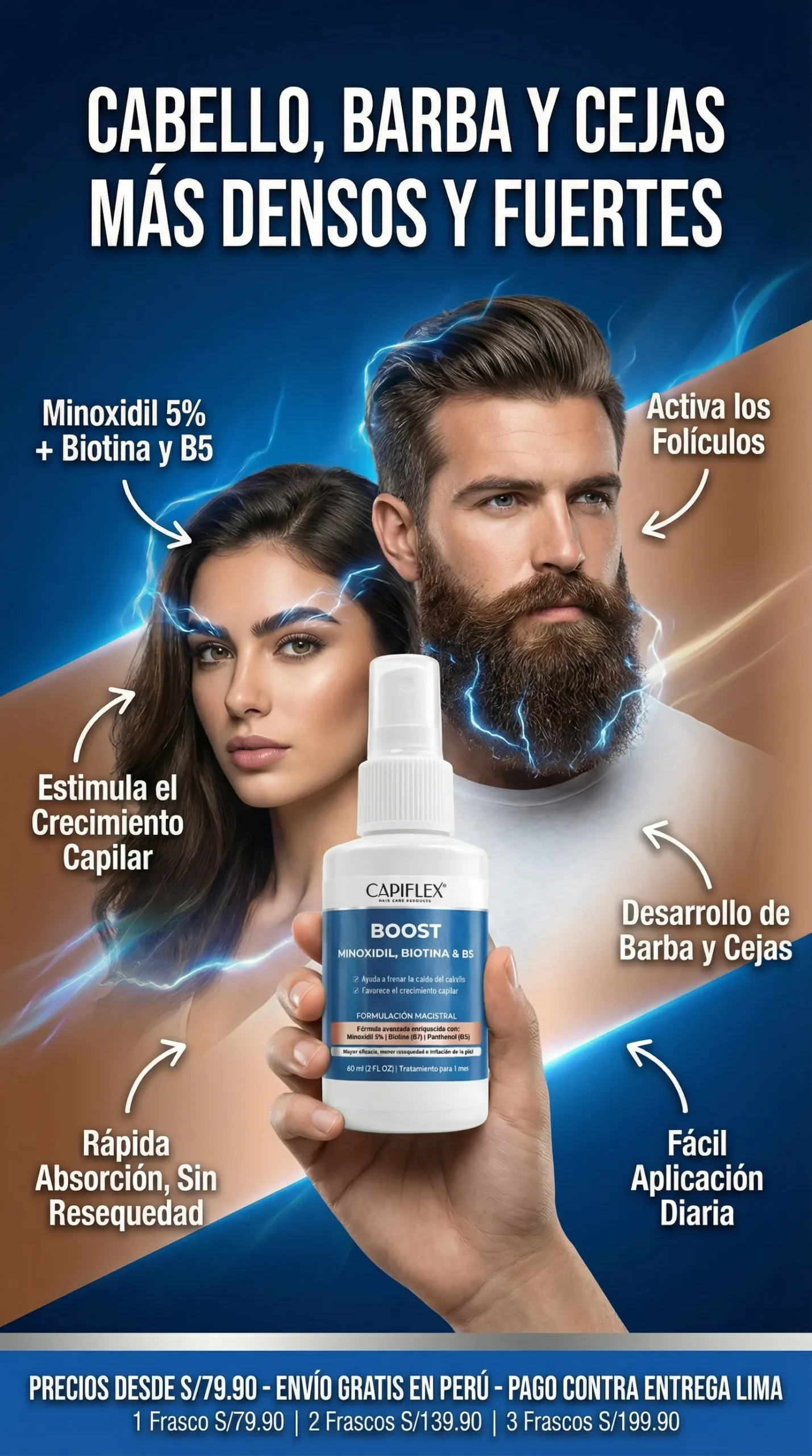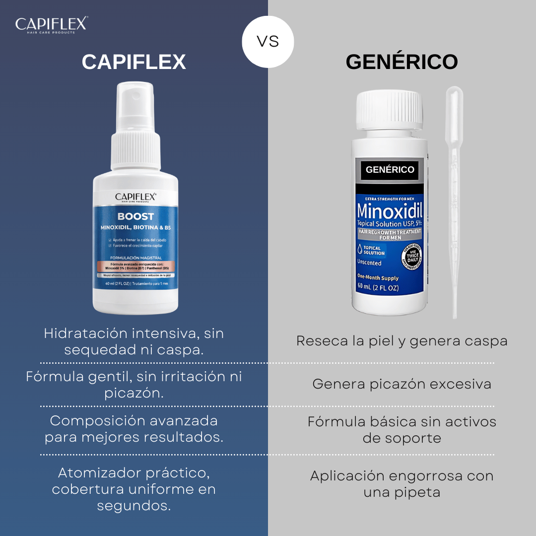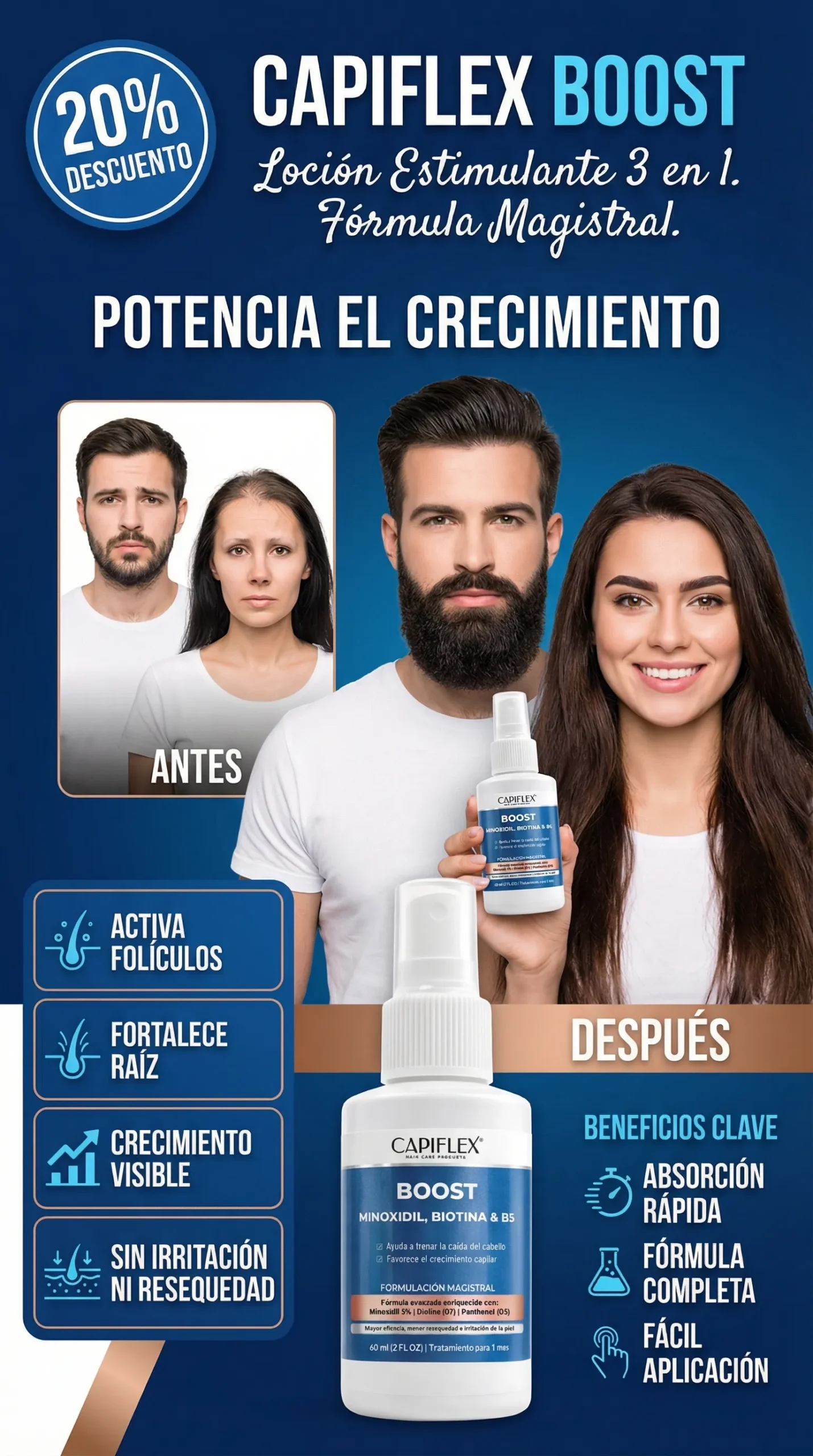 Capiflex Minoxidil & Biotina es la loción magistral diseñada para quienes buscan fortalecer su cabello, frenar la caída y estimular el crecimiento de nuevos folículos. Con una formulación avanzada de Minoxidil 5%, Biotina y Panthenol, este tratamiento de uso diario reactiva el ciclo capilar y potencia la regeneración desde la raíz, ofreciendo una solución eficaz y amigable con la piel.