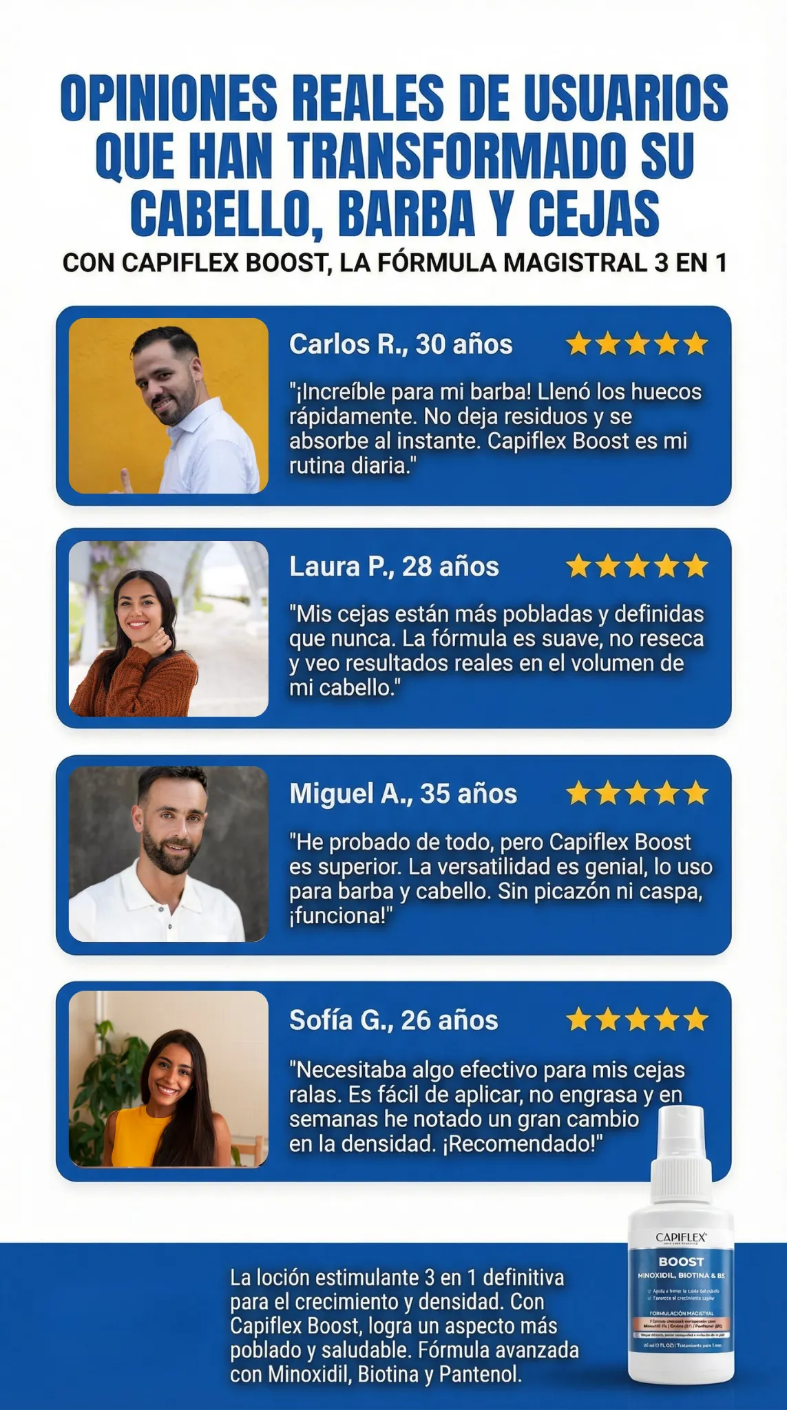 Al fin algo que si sirve para la alopecia. habia probado hasta remedios caseros q vi en youtube y x las puras fue. Con capiflex ya voy en el segundo frasco y mi barbero me pregunto q me estaba echando xq vio mas volumen. vale la pena la inversion.