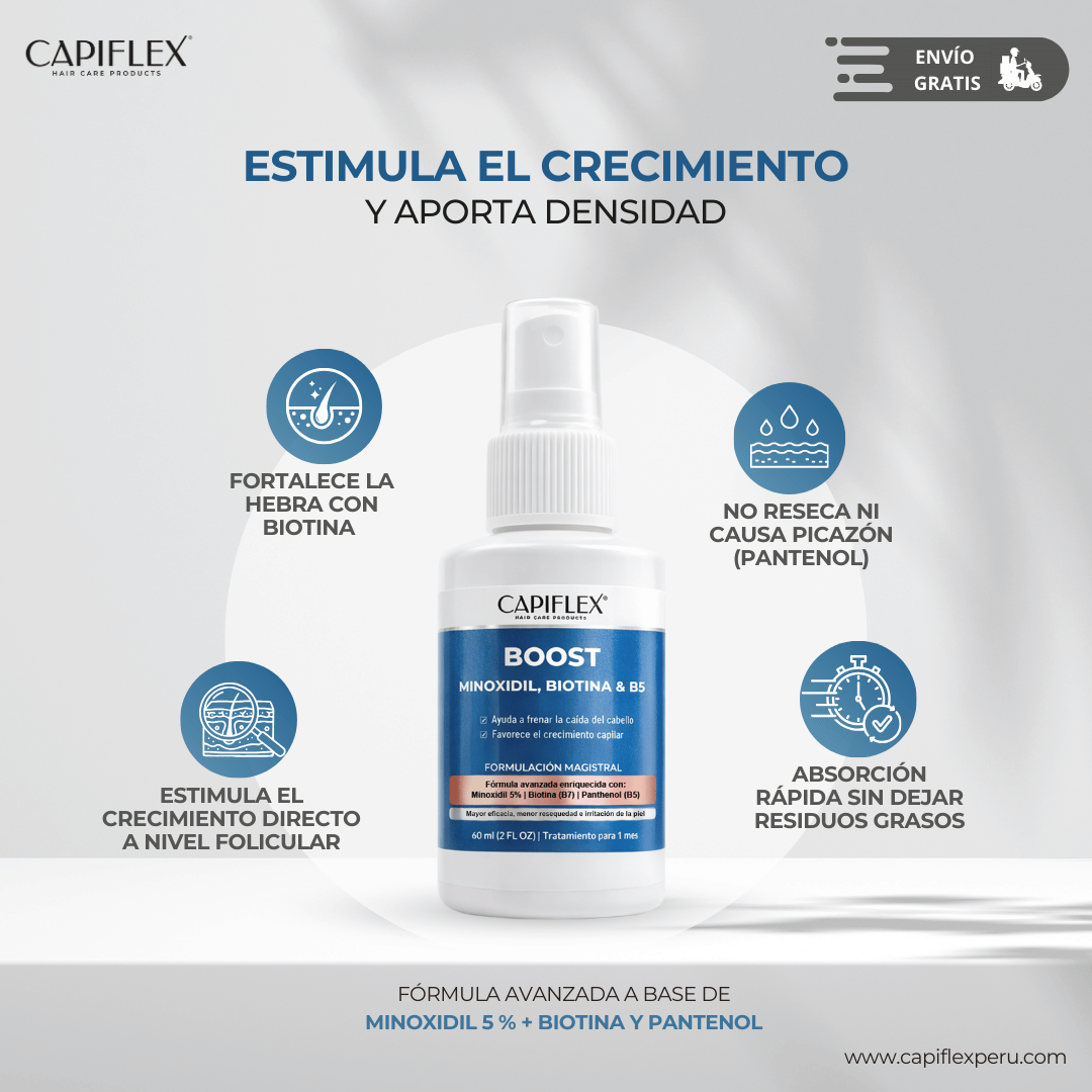 Este producto es leave-in (no se enjuaga). Capiflex Boost es un tratamiento para un mes (60 ml), asegurando un uso constante y resultados progresivos.